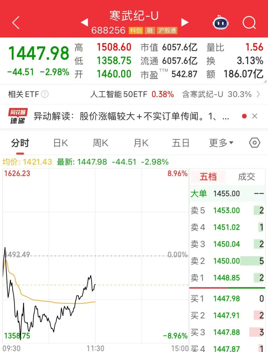 9月1日,寒武纪短线跳水,跌幅一度扩大至8.96%,股价一度跌破1400元。截至午盘,跌幅为2.98%,最新股价报1447.98元。