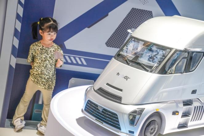 摆放在无人直升机旁边的,是一台氢能卡车模型。这台车来自大兴国际氢能示范区企业,续航里程最大可达1000公里。与传统燃气、石油等化石能源相比,氢能更大的环保优势是具有零碳排放属性,氢气燃烧和氢燃料电池电化学反应的排放物基本是水,是最环保的能源。