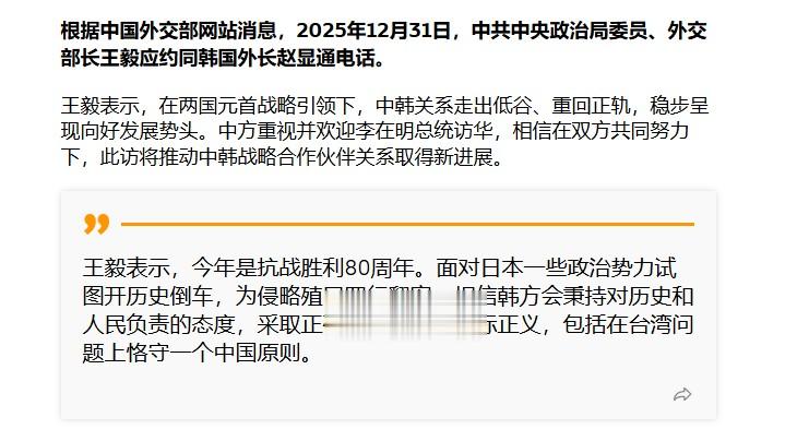 同时还据俄罗斯卫星通讯社报道,在2025年12月31日,王毅应约跟韩国外交部长赵显通了电话。